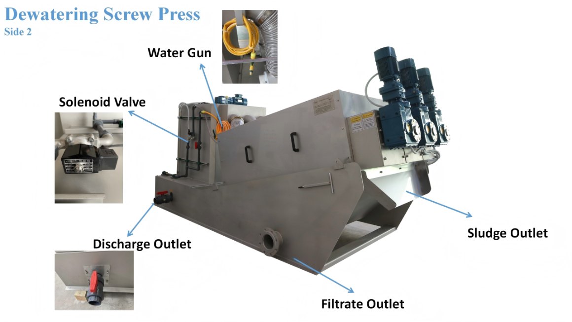 - Continuous Dewatering (Pressure Zone): The thickened sludge moves forward along the screw. The pitch of the spiral blade gradually decreases towards the discharge end, shrinking the cavity volume. Combined with the resistance from the back pressure plate, the internal pressure increases, continuously squeezing out moisture to produce a high-solid filter cake.